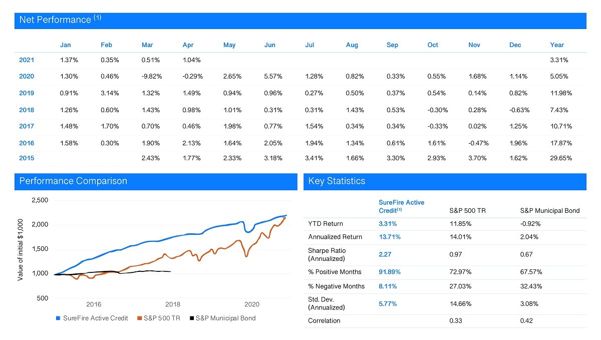 (1) Fund inception on is May 1, 2018. The performance results reflected on the tables above as well as accompanying tables for periods prior to the Fund’s inception on date represent the Fund’s performance based on the performance of the Fund’s underlying portfolio managers as noted, are based on the assumptions noted for each chart, and are net of (i) fees and incentive allocations to those portfolio managers and the Fund, and (ii) transaction costs and other expenses incurred by the portfolio managers. The leverage assumptions, if any, reflected on the tables above as well as accompanying tables can have a significant effect on performance results, and is not necessarily indicative of actual leverage used by the portfolio managers during those periods, and is subject to change. All of the underlying performance information has been provided by the portfolio managers, and although assumed to be reliable, has not been independently verified and cannot be guaranteed. ” makes no representations or warranties as to the accuracy or completeness of such information. The actual rates of return for investors in the Fund may differ. Past performance is not a guarantee of future results. The Fund may not receive the performance results from a portfolio manager until several months after month‐end. After the Fund’s administrator calculates that month’s performance results from the Portfolio Funds, the performance table above will be updated. No assurance can be given that the results for those unreported months are consistent with prior periods. This Tear Sheet and related disclosures do not constitute an offer or solicitation to purchase an interest in ” Active Credit, LP (“Fund”) or any related vehicle managed by ” Active Credit Management, LP (“Sponsor”). The Fund has prepared a Confidential Private Placement Memorandum (“Memorandum”) for the offering of interests in the Fund. Before you invest, you should read the Memorandum for more complete information about the Fund and the offering. The information contained in this presentation is qualified in its entirety by reference to the Memorandum. There are substantial risks to investing in the Fund and all interested parties should carefully consider them prior to investing. Results are compared to the performance of any listed index such as the S& P 500 Total Return Index and the S& P Municipal Bond Index (“Comparative Indexes”) for informational purposes only. The Portfolio Fund’s investment programs do not mirror the Comparative Indexes and the volatility of a Portfolio Fund’s investment program may be materially different from that of the Comparative Indexes. The securities or other assets included in the Comparative Indexes are not necessarily included in any or all of the investment programs of the Portfolio Fund and criteria for inclusion in the Comparative Indexes may be different than those for investment by the Portfolio Fund. The performance of the Comparative Indexes was obtained from published sources believed to be reliable, but which are not warranted as to accuracy or completeness. Unless noted otherwise, the returns of the Comparative Indexes presented herein do not reflect fees or transaction costs, but those returns do reflect net dividends if any. Past performance is neither indicative nor a guarantee of future results. No assurance can be made that profits will be achieved or that substantial losses will not be incurred.